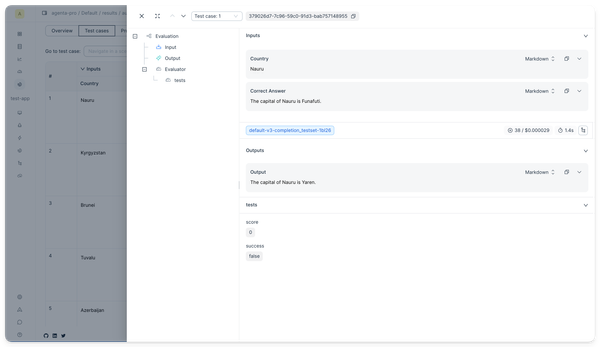 If you click on a test case, you will see a drawer with the full output and the evaluator results.